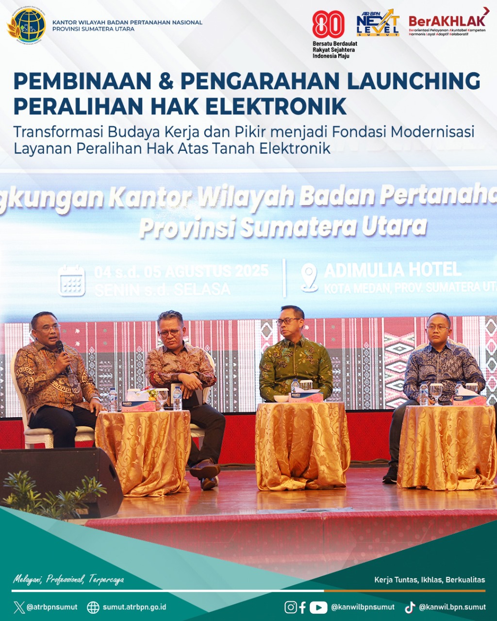 Medan | KABARBERANDA — Kantor Wilayah Badan Pertanahan Nasional (BPN) Provinsi Sumatera Utara menyelenggarakan kegiatan Pembinaan dan Pengarahan Launching Peralihan Hak Elektronik di Hotel Adimulia Medan pada Senin (04/08). Kegiatan ini merupakan langkah strategis dalam mendukung transformasi digital layanan pertanahan di seluruh Kantor Pertanahan se-Sumatera Utara.