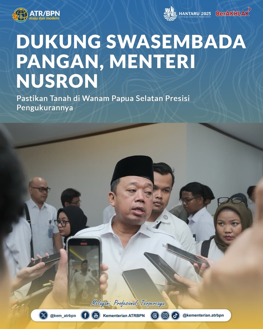 Jakarta | METRO ONENEWS.Com – Kementerian Agraria dan Tata Ruang/Badan Pertanahan Nasional (ATR/BPN) mendukung swasembada pangan di daerah Wanam, Kabupaten Merauke, Papua Selatan, dengan memastikan tanah hasil pelepasan kawasan hutan betul-betul sesuai pengukurannya. Hal ini disampaikan oleh Menteri ATR/Kepala BPN, Nusron Wahid, dalam Rapat Koordinasi Terbatas (Rakortas) Percepatan Pembangunan Kawasan Swasembada Pangan, Energi, dan Air Nasional Wilayah Wanam Papua Selatan, Senin (29/09/2025).