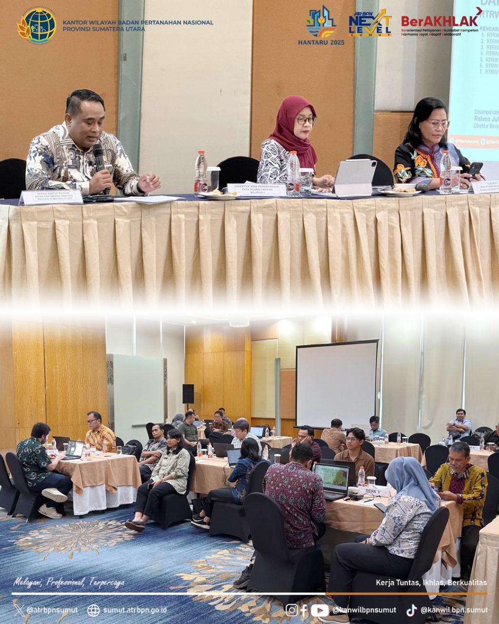Kegiatan ini dihadiri oleh Ibu Rahma Julianti, S.T., M.Sc selaku Direktur Bina Perencanaan Tata Ruang Daerah Wilayah I Kementerian ATR/BPN, Ibu Detty Theresia Putung, S.T., M.T selaku Kepala Subdirektorat Bina Perencanaan Tata Ruang Daerah Wilayah I.B Kementerian ATR/BPN, serta Bapak Sri Pranoto, S.SiT., M.M. selaku Kepala Kantor Wilayah BPN Provinsi Sumatera Utara.