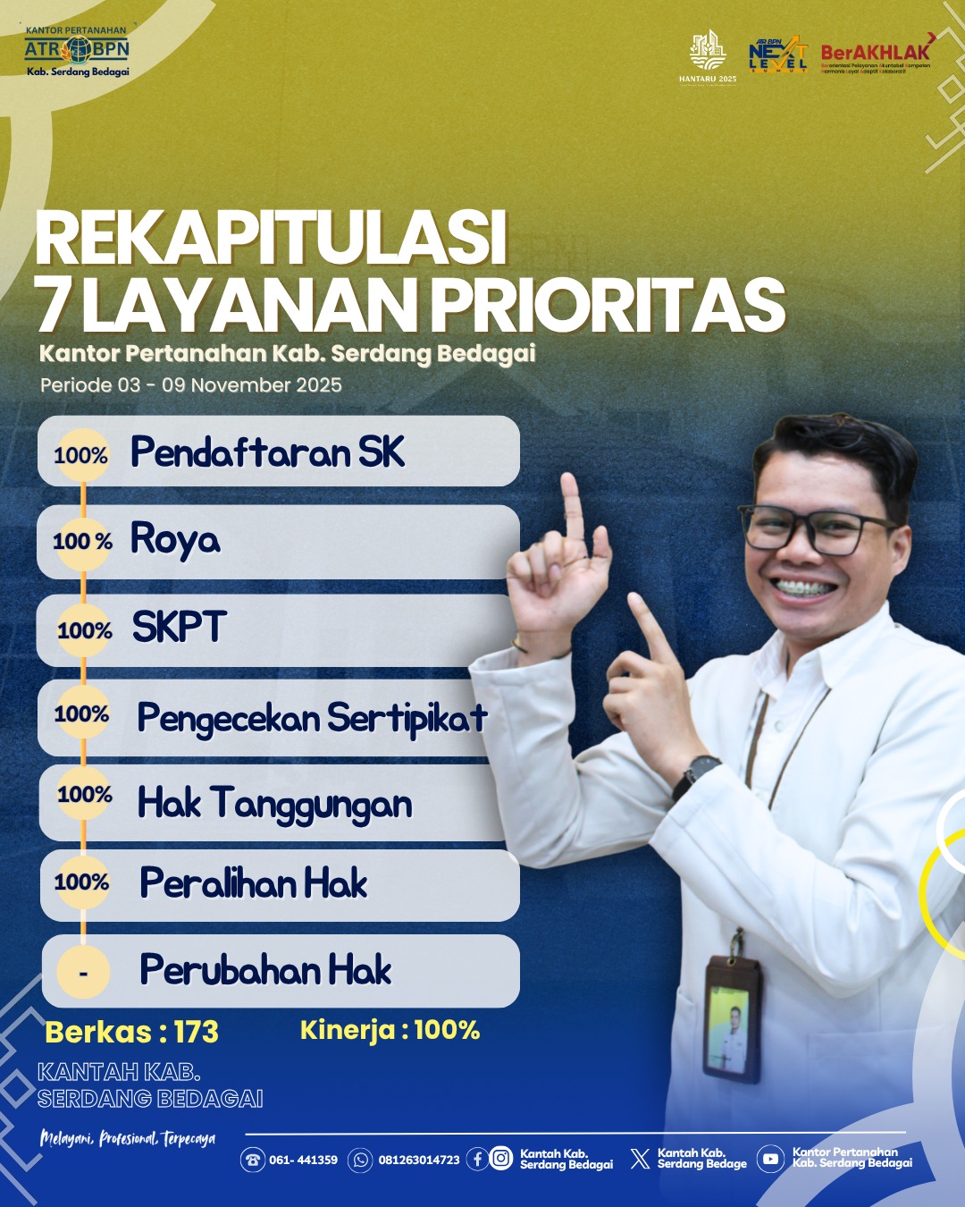 Berikut mimin share ya nilai kinerja kita. Ayo Follow, Subscribe, Like, Share dan Update Informasi seputar Kantor Pertanahan Kab. Serdang Bedagai melalui akun media sosial kami : FB & IG : KantahKabSergai. X : KantahKabSerge. YT : Kantor Pertanahan Kab. Serdang Bedagai. TT : KantahKabSergai. (Rel/SB)
