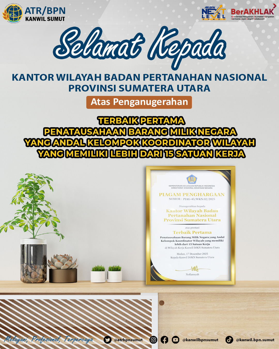 Medan | METRO ONE News – Selamat dan Apresiasi kepada Kantor Wilayah Badan Pertanahan Nasional Provinsi Sumatera Utara atas diraihnya Piagam Penghargaan sebagai Penatausahaan Barang Milik negara yang Andal Kelompok Koordinator Wilayah yang memiliki lebih dari 15 Satuan Kerja dari Kementerian Keuangan Republi Indonesia Direktorat Jenderal Kekayaan Negara Kantor Wilayah Direktorat Jenderal Kekayaan Negara Sumatera Utara