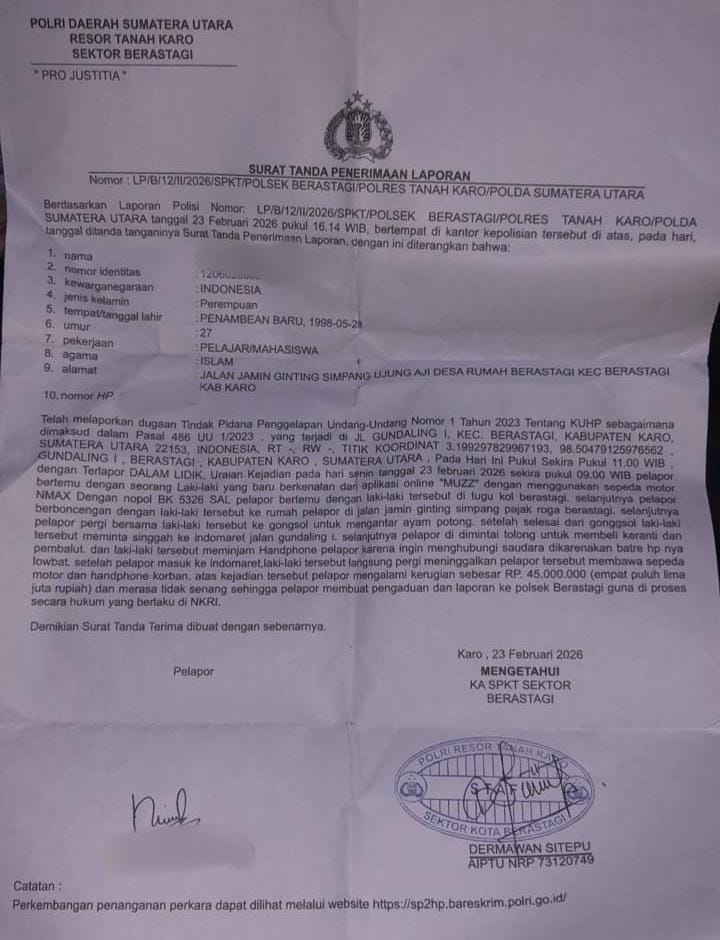 Atas kejadian tersebut Nia Rahayu mengalami kerugian sebesar Rp.45.000.000. Atas kejadian korban melaporkan kejadian ke Mapolsek Berastagi, sesuai nomor LP / B / 12 / II / 2026 / SPKT / Polsek Berastagi/ Polres Tanah karo. Korban berharap pelaku segera ditangkap.