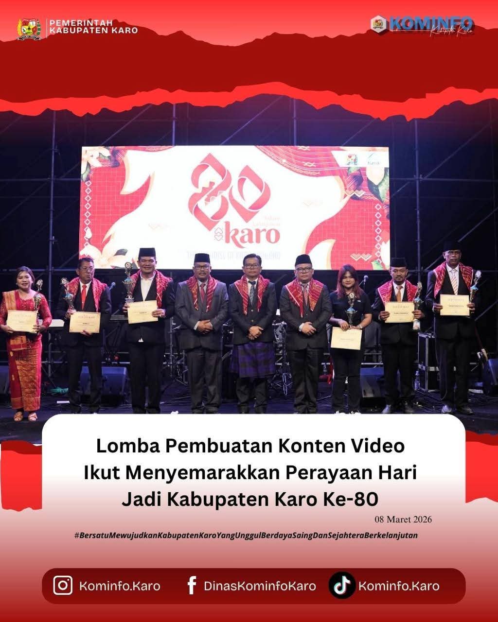 Rangkaian acara perayaan Hari Jadi Karo ke 80 berlangsung meriah dan kondusif. Lomba Pembuatan Konten Video ikut menyemarakkan perayaan Hari Jadi Kabupaten Karo Ke-80. Lomba ini bertujuan menjadi wadah bagi para kreator konten untuk mengemas pesan edukatif, layanan publik, atau isu sosial. Lomba ini diikuti 41 OPD dan Kecamatan.
