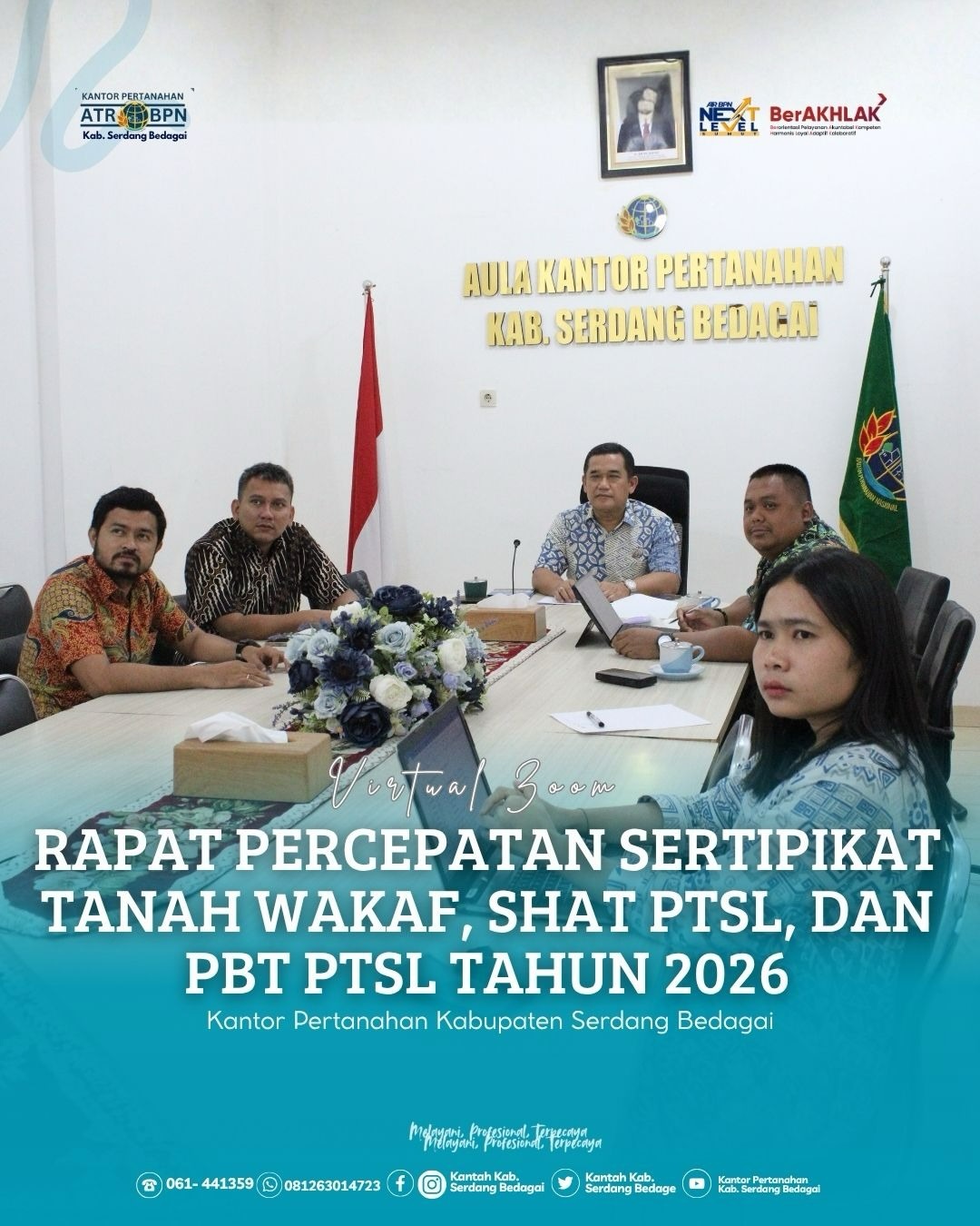 Kantor Pertanahan Kabupaten Serdang Bedagai Mengikuti Rapat Virtual Percepatan Sertipikasi Tanah Wakaf, SHAT PTSL, dan PBT PTSL Tahun 2026.