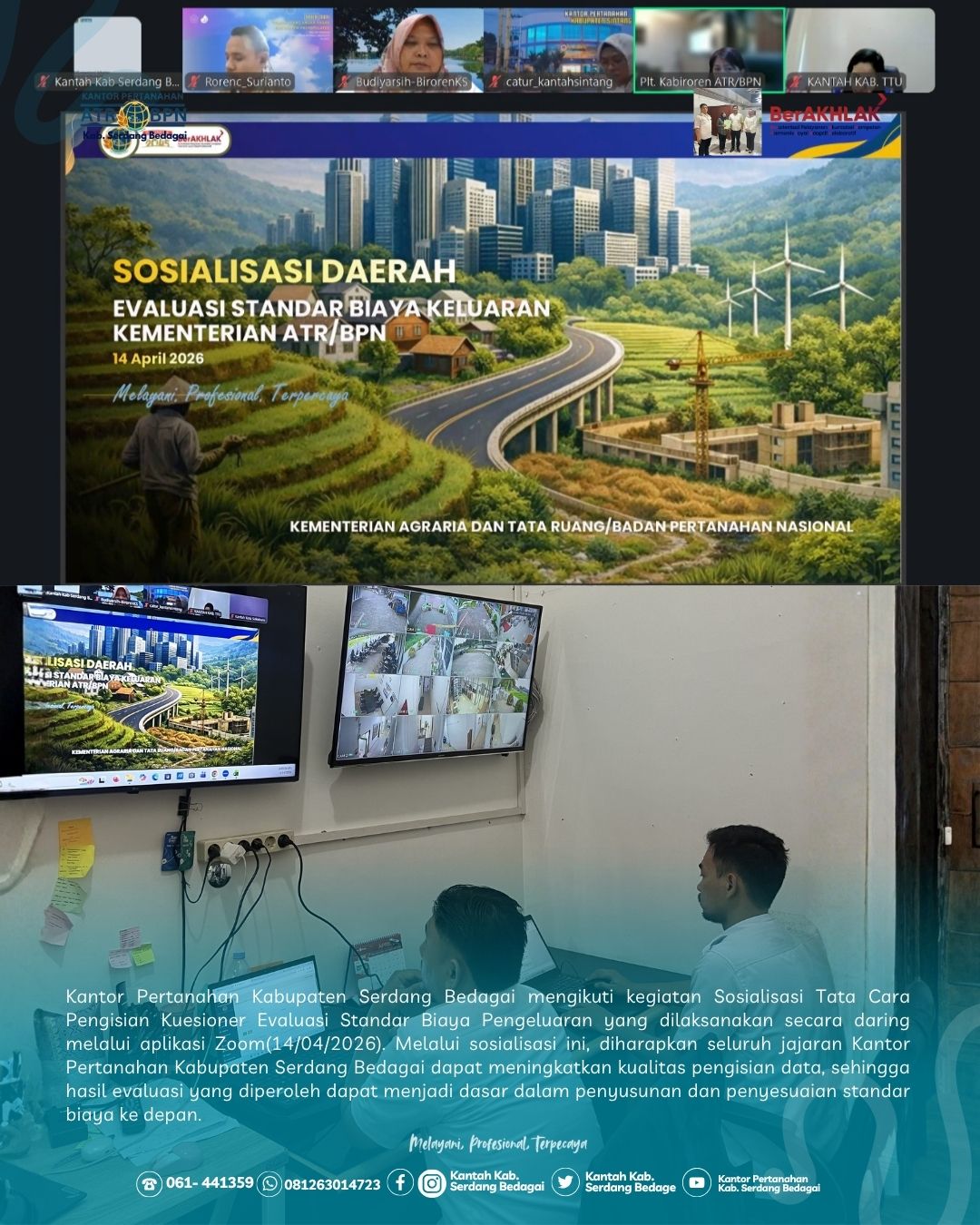 Serdang Bedagai | METRO ONE News – Kantor Pertanahan Kabupaten Serdang Bedagai mengikuti kegiatan Sosialisasi Tata Cara Pengisian Kuesioner Evaluasi Standar Biaya Pengeluaran yang dilaksanakan secara daring melalui aplikasi Zoom(14/04/2026).