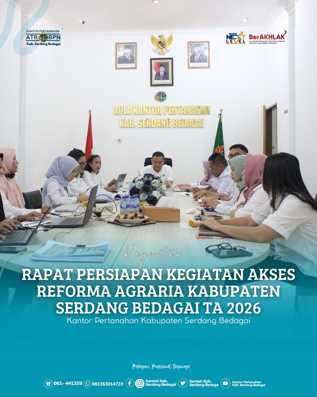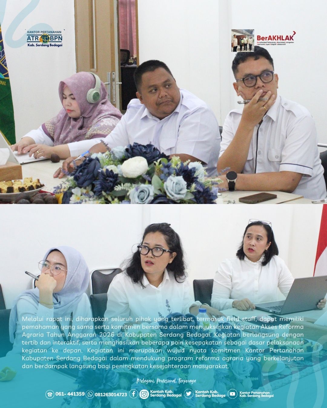 Melalui rapat ini, diharapkan seluruh pihak yang terlibat, termasuk field staff, dapat memiliki pemahaman yang sama serta komitmen bersama dalam menyukseskan kegiatan Akses Reforma Agraria Tahun Anggaran 2026 di Kabupaten Serdang Bedagai.