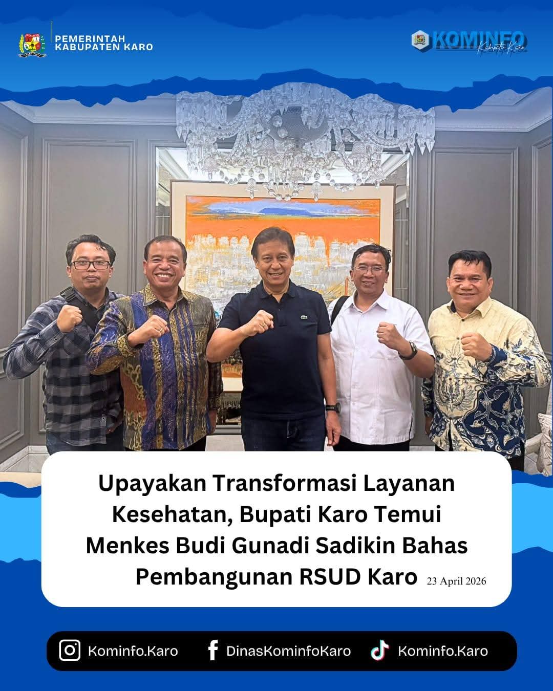 Jakarta | METRO ONE News – Bupati Karo, Brigjen Pol (Purn) Dr. dr. Antonius Ginting, Sp.OG, M.Kes melakukan pertemuan strategis dengan Menteri Kesehatan RI, Budi Gunadi Sadikin, guna membahas rencana besar pembangunan Rumah Sakit Umum Daerah (RSUD) Karo. Pertemuan berlangsung di Jakarta, pada Kamis (23/4/2026). Pertemuan ini menjadi langkah krusial bagi masa depan infrastruktur kesehatan di Tanah Karo.