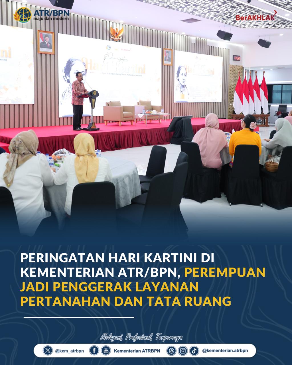 Dalam acara Peringatan Hari Kartini tahun 2026 yang diinisiasi oleh Korps Pegawai Republik Indonesia (KORPRI) Kementerian ATR/BPN ini, Dalu Agung Darmawan mengingatkan agar seluruh jajaran, termasuk jajaran perempuan senantiasa menjaga kesehatan jasmani dan rohani. “Untuk menjadi penggerak pertanahan dan tata ruang, perempuan harus menjaga kesehatan sebagai fondasi utama,” pungkasnya.
